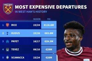 体育资讯7月11日讯 西汉姆边锋库杜斯转会热刺,据德国转会市场统计,他是西汉姆队史出售的第二贵球员,最贵球员是1.166亿欧转会费的赖斯。